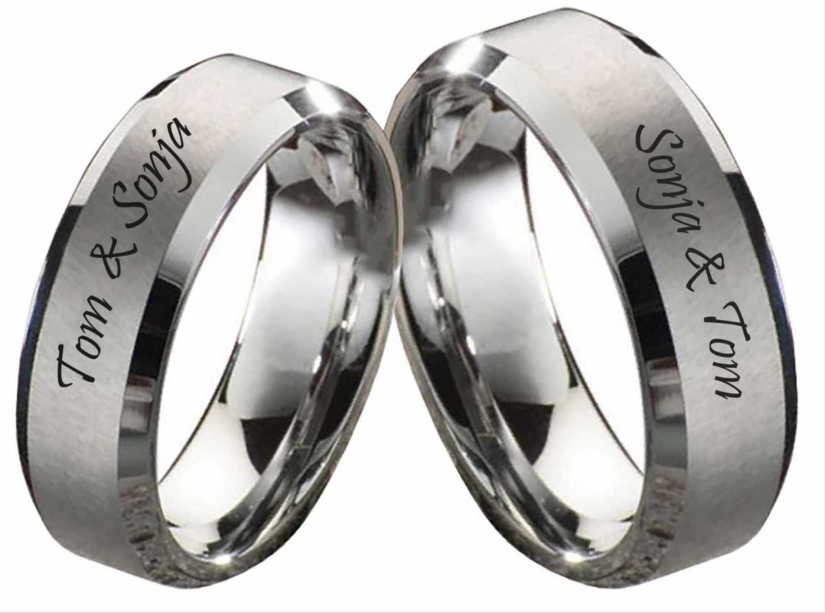 Blendende Wolframringe mit gratis Gravur aus dem Hause Rings-and-More Diese Partnerringe aus Wolfram sind auf der Aussenflaeche poliert, mattiert und abgerundet, dadurch stechen sie sofort ins Auge. Zusaetzlich kann eine kostenfreie Lasergravur angebracht werden. Durch diese Botschaft wird die Verbundenheit der beiden Traeger zum Ausdruck gebracht. Diese Ausgefallene Wolframringe haben eine Breite von 8mm und sind auf der Innenseite poliert und bombiert. Dadurch ist das Tragegefuehl sehr angenehm. Die Gravur kann 30 Zeichen lang sein und es stehen sieben Schriftarten zur Verfuegung. Ein edles schwarzes gratis Etui wird mitgeschickt. Im Preis sind die Kosten fuer den Versand innerhalb von Deutschland enthalten. Ringmodell: PW127 Marke: Rings-and-More Ringmaterial : Wolfram Ringmaterial : massiv Ringbreite Dame: ca. 8,0 mm Ringbreite Herr: ca. 8,0 mm Oberflaeche: poliert und mattiert Innen: bombiert (abgerundet) Innenseite: poliert Damenringgroessen: 47 bis 72 mm (nur in 2er Schritten verfuegbar) Herrenringgroessen: 47 bis 72 mm (nur in 2er Schritten verfuegbar) Lieferumfang : 1x Paar (1x Damenring und 1 x Herrenring) und gratis Etui