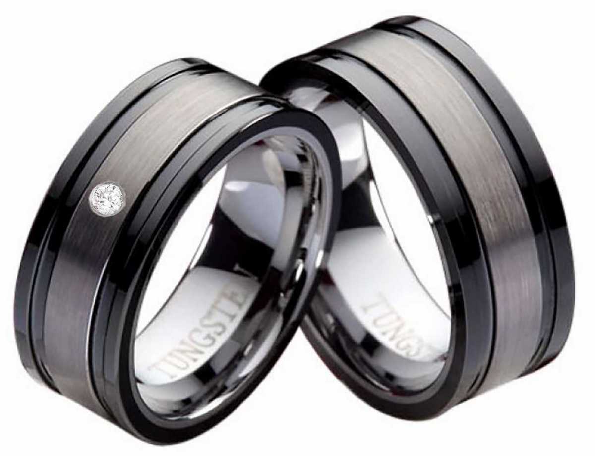 Grandiose Wolframringe mit runden Zirkonia Mit diesen 8,0 mm breiten teilweise schwarze beschichteten Partnerringen aus Wolfram entscheidet man sich fuer wahre Glanzstuecke. Die Aussenflaeche ist mattiert und auf dem Damenring funkelt ein zauberhaft schoener 1,5mm grosser runder Zirkonia. Auf der bombierten und polierten Innenseite kann man die Traegerin und/ oder den Traeger mit einer gratis Lasergravur ueberraschen. Zur Verfuegung stehen hierfuer 30 Zeichen und sieben Schriftarten. Falls man diese Freundschafts- oder Trauringe mal nicht tragen moechte, kann man sie gut in dem edlen gratis Etui, welches mitgeliefert wird, aufbewahren. Die Versandkosten sind deutschlandweit inklusive. Ringmodell: PW152 Marke: Rings-and-More Ringmaterial : Wolfram Ringmaterial : massiv Beschichtet: schwarz Ringbreite Dame: ca. 8,0 mm Ringbreite Herr: ca. 8,0 mm Steinbesatz im Damenring: Zirkonia Steingroesse: ca.1,5mm Oberflaeche: mattiert Innen: bombiert (abgerundet) Innenseite: poliert Damenringgroessen: 50 bis 60 mm (nur in 2er Schritten verfuegbar) Herrenringgroessen: 50 bis 60 mm (nur in 2er Schritten verfuegbar) Lieferumfang : 1x Paar (1x Damenring und 1 x Herrenring) und gratis Etui