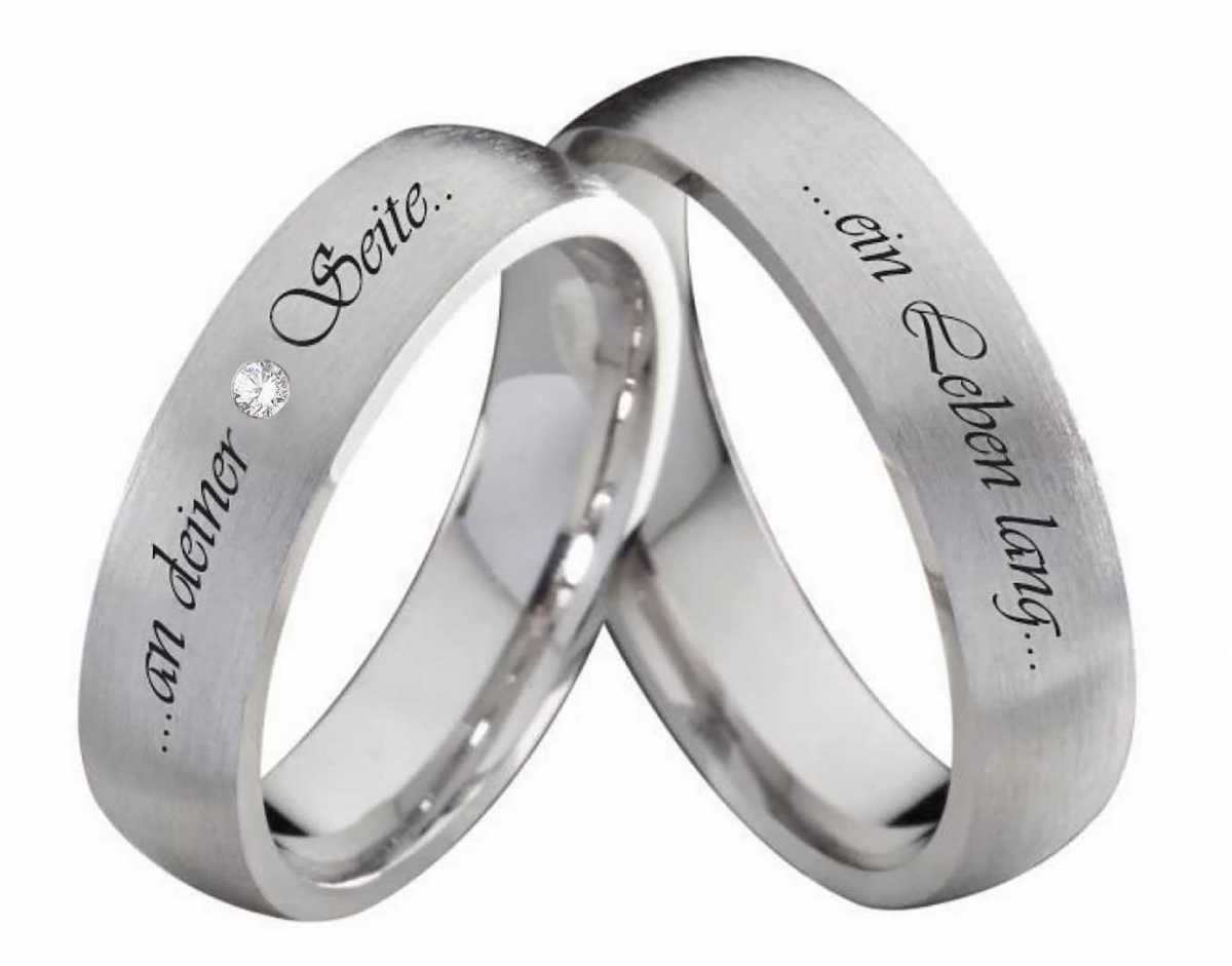 Silberringe mit Aussengravur und einem Zirkonia oder Diamant Diese aussen gravierbaren Partnerringe aus 925er Sterling Silber sind an der Oberflaeche aussen mattiert und auf der Innenseite poliert. Beide Ringe haben eine Breite von 5,0 mm und sind innen so abgerundet, dass der hochwertige Tragekomfort garantiert ist. Die gratis Gravur kann auf der mattierten Aussenflaeche angebracht werden. Dafuer gibt es sieben Schriftarten, womit man seine Liebe und Freundschaft in Worte fassen kann. Der weisse runde 1,5mm grosse Zirkonia  oder Diamant schmueckt den Damenring. Der Herrenring ist ohne Stein. Extra fuer dieses edle Ring-Set wird ein gratis Etui mitgeliefert, zur sicheren Aufbewahrung. Die Kosten fuer den Versand innerhalb von Deutschland ist selbstverstaendlich inklusive. Die Ringe koennen auch als Verlobungsringe, Trauringe oder Freundschaftsringe getragen werden. Ringmodell: PS920 Marke: Rings-and-More Ringmaterial : Silber 925/- Ringbreite Dame: ca. 5mm Ringbreite Herr: ca. 5mm Steinbesatz im Damenring : Zirkonia oder Diamant Steingroesse: ca.1,5mm oder 0,01ct W/Si Oberflaeche: gebuerstet Damenringgroessen: 50 bis 70 Herrenringgroessen: 50 bis 70 Lieferumfang : 1 Paar (1x Damenring und 1 x Herrenring) und gratis Etui