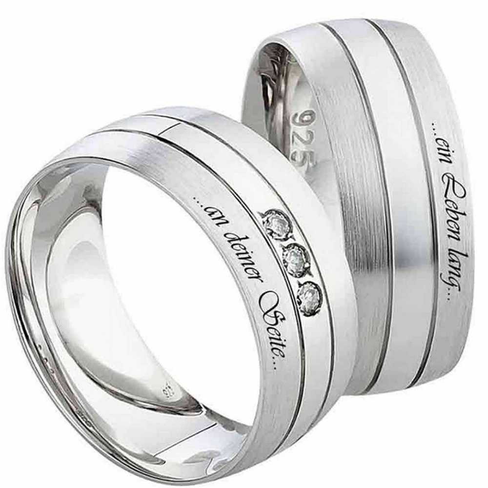 Elegante 8,0 mm breite Silberringe mit drei Zirkonias Auf diesen eleganten Partnerringen aus 925er Silber kann man auf der Oberflaeche aussen eine gratis Gravur anbringen lassen. Zusaetzlich sind diese 8,0 mm breiten Silberringe durch zwei hochwertige Glanzrillen geschmueckt. Im Damenring sind drei weisse Zirkonias der Groesse 2,0 mm eingefasst. Die Aussenflaeche ist mattiert und die Innenseite poliert und abgerundet. Die Freundschaftsringe werden in einer schoenen schwarzen Box geliefert. Deutschlandweit sind die Kosten fuer den Versand im Angebot enthalten. Partnerringe gravierbar aus Sterlingsilber Zirkonias SR006-SR007g mit Gravur. Ringmodell: PSR006-SR007g Marke: Mabro Ringmaterial : Silber 925/-rhodiniert Ringbreite Dame: ca. 8mm Ringbreite Herr: ca. 8mm Steinbesatz im Damenring : 3x Zirkonia Steingroesse: ca.2 mm Oberflaeche: mattiert und poliert Damenringgroessen: 50 bis 62 Herrenringgroessen: 54 bis 70 Lieferumfang : 1 Paar (1x Damenring und 1 x Herrenring) und gratis Etui