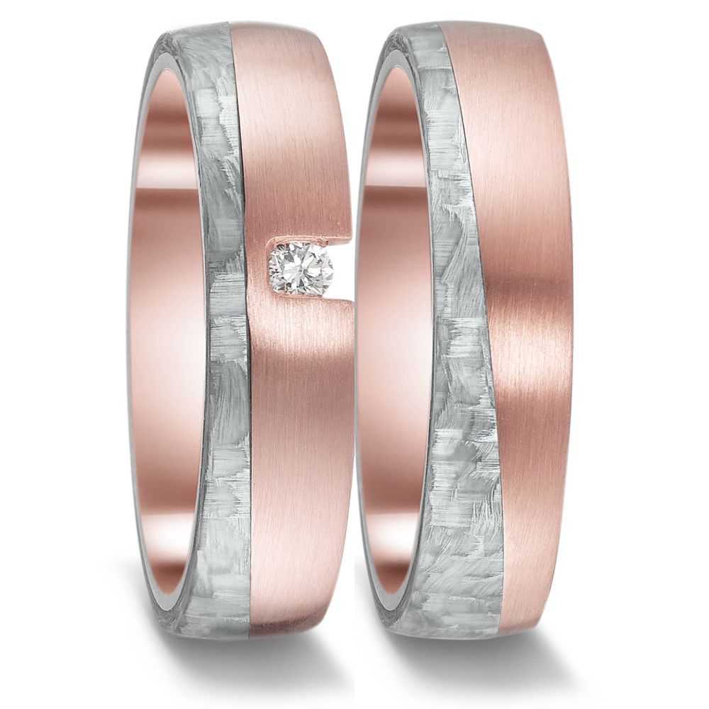 Ringmodell:Â 52620/001/005/5N79-52620/001/000/5N79 Kollektion: Trauringe-Carbon Marke: Titanfactory Ringmaterial : Carbon und 585 Rotgold Farbe Carbon: Grau Ringbreite Dame:Â ca. 5mm Ringbreite Herr:Â ca. 5mm Steinbesatz im Damenring :Â 1x Diamant Steingroesse: gesamt 0,05ct W/SIÂ Damenringgroessen: 50 bis 62 Herrenringgroessen: 50 bis 70 Lieferumfang : 1 Paar (1x Damenring und 1 x Herrenring) und gratis Etui Â