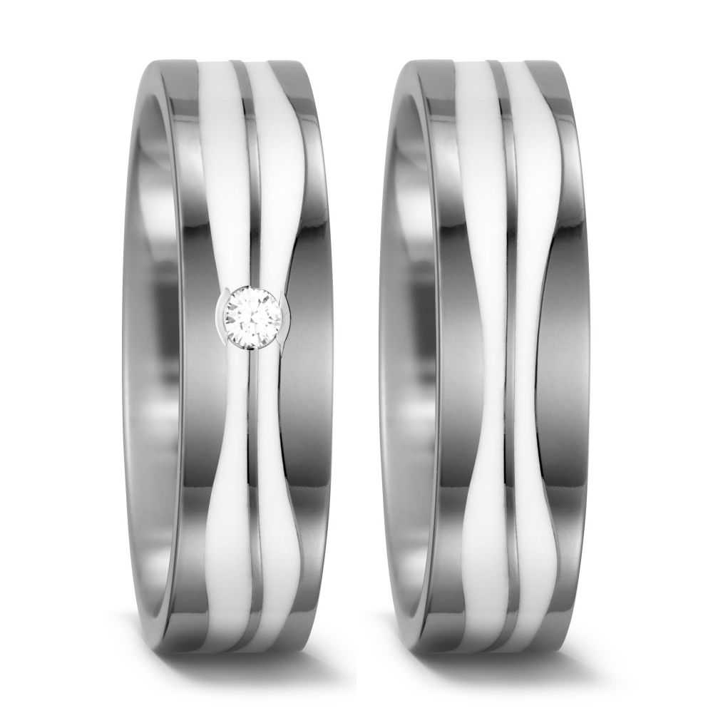 Ringmodell: 52396/001/575/2002-52396/001/570/2002 Kollektion: Trauringe-Titan-Keramik Marke:Titanfactory Ringmaterial : Titan und Keramik Keramik : weiss Ringbreite Dame: ca. 6mm Ringbreite Herr: ca. 6mm Steinbesatz im Damenring :  1x Diamant Steingroesse: 0,05ct W/SI Oberflaeche: mattiert Damenringgroessen: 50 bis 62 Herrenringgroessen: 50 bis 70 Lieferumfang : 1 Paar (1x Damenring und 1 x Herrenring) und gratis Etui Â
