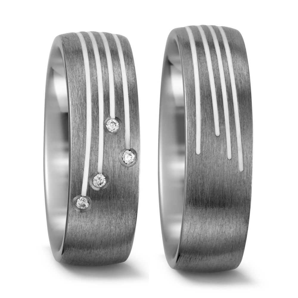 Ringmodell: 52411/013/574/2002-52411/013/570/2002 Kollektion: Trauringe-Titan-Keramik Marke:Titanfactory Ringmaterial : Titan und Keramik Keramik : weiss Ringbreite Dame: ca. 6,5mm Ringbreite Herr: ca. 6,5mm Steinbesatz im Damenring :  4x Diamant Steingroesse: gesamt 0,04ct W/SI Oberflaeche: eismatt Damenringgroessen: 50 bis 62 Herrenringgroessen: 50 bis 70 Lieferumfang : 1 Paar (1x Damenring und 1 x Herrenring) und gratis Etui Â