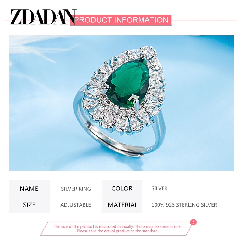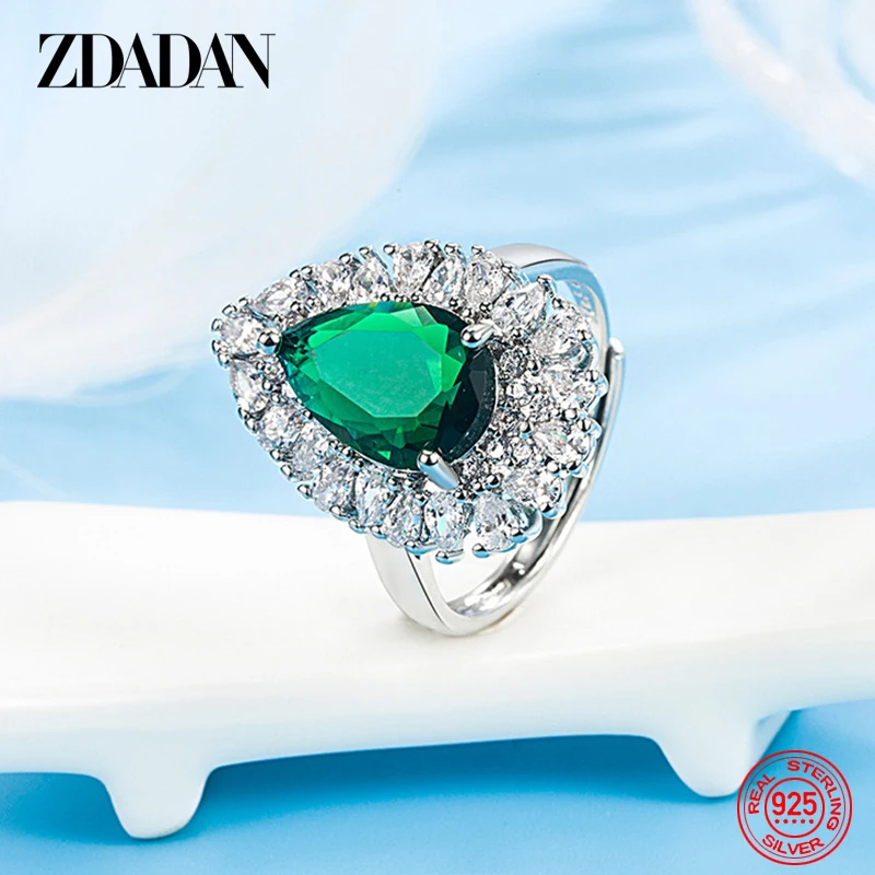 Zdadan Sterling Silber Wasser tropfen Smaragd verstellbarer Ring für Damen Modeschmuck