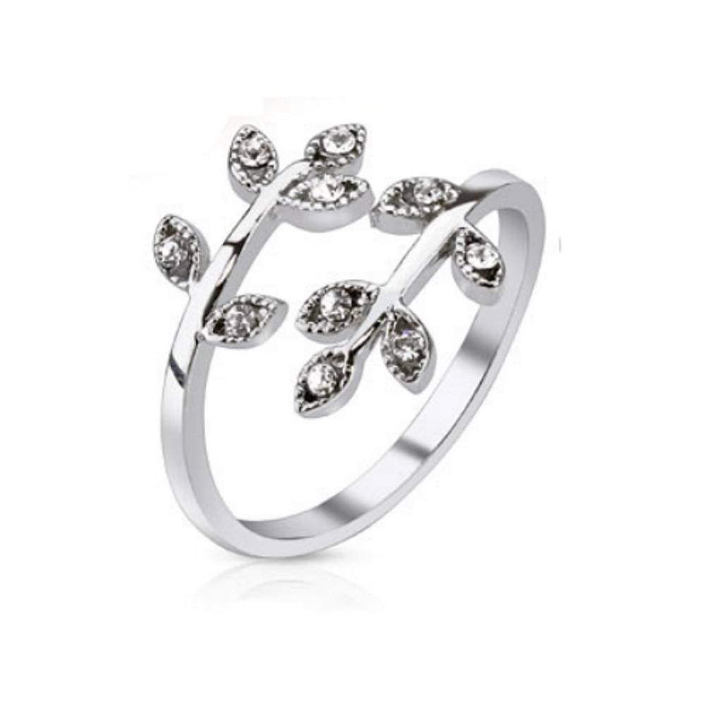 Silberner Mittelring mit Blaetter und strahlenden Zirkonia Kristallen fuer Damen – kann sowohl als Zehring als auch Mittelring / Fingerring getragen werden