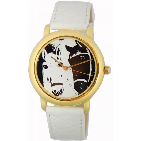 ZENO, Pferde black & white, Quartzuhr vergoldet, weiss